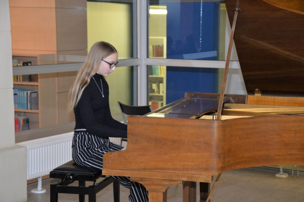 Muzikos mokyklos ketvirtokė Ieva – mergaitė, sugebanti rasti laiko ne tik groti. Dar ji užsiima ir daile, ir karatė sportu. Visgi pasirodydama publikai viešai jaudinasi – karantinas su pandemija padarė savo: „Truputį baisu koncertuoti, bet noriu, kad į biblioteką atėję žmonės prieš šventes tiesiog pasidžiaugtų“.