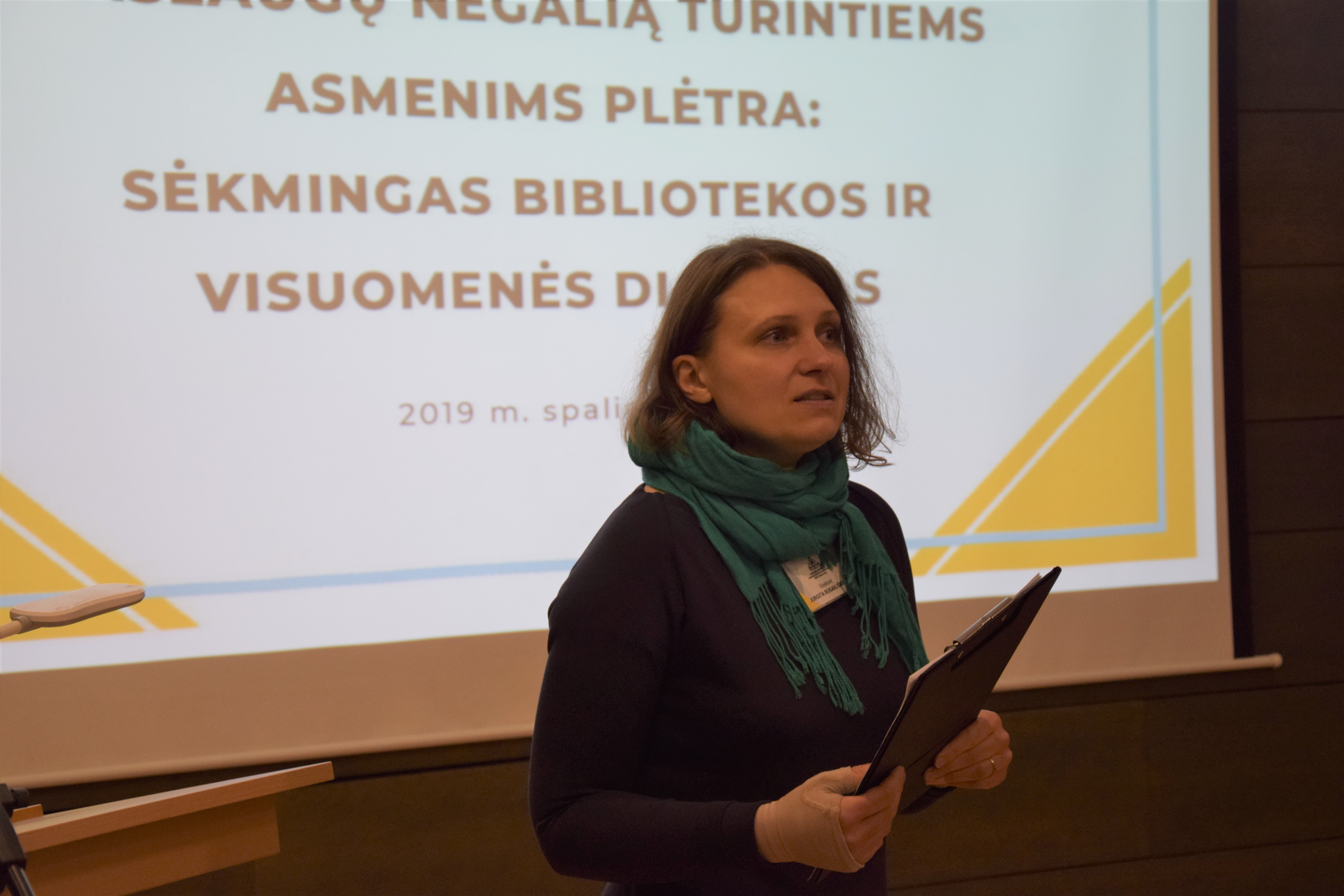 Lietuvos nacionalinės Martyno Mažvydo bibliotekos Bibliotekininkystės centro vadovė dr. Rasa Januševičienė pranešimą pradėjo apžvelgdama LR ir tarptautinius teisės aktus, reglamentuojančius teisinę bazę, skirtą neįgaliesiems žmonėms. Pažymėjo, kad 8,5 proc. Lietuvos gyventojų turi negalią (PSO duomenimis). Pastebėtina, kad šiuo metu Lietuvoje daugėja autizmo spektro negalią turinčių vaikų, todėl ypač svarbu, kad bibliotekos orientuojasi į naujų veiklų kūrimą vaikams, turintiems autizmo spektro sutrikimą. Pranešime dalinosi geraisiais pavyzdžiais, kaip kultūros turinio prieinamumas pritaikomas viešosiose erdvėse: kino teatruose, muziejuose, dramos teatruose. Minėjo, kad poreikis neįgaliesiems spektaklius stebėti su garsiniu vaizdavimu didėja. Šiuo metu Lietuvoje yra 13 spektaklių, kuriuos gali stebėti regos negalią turintys asmenys.