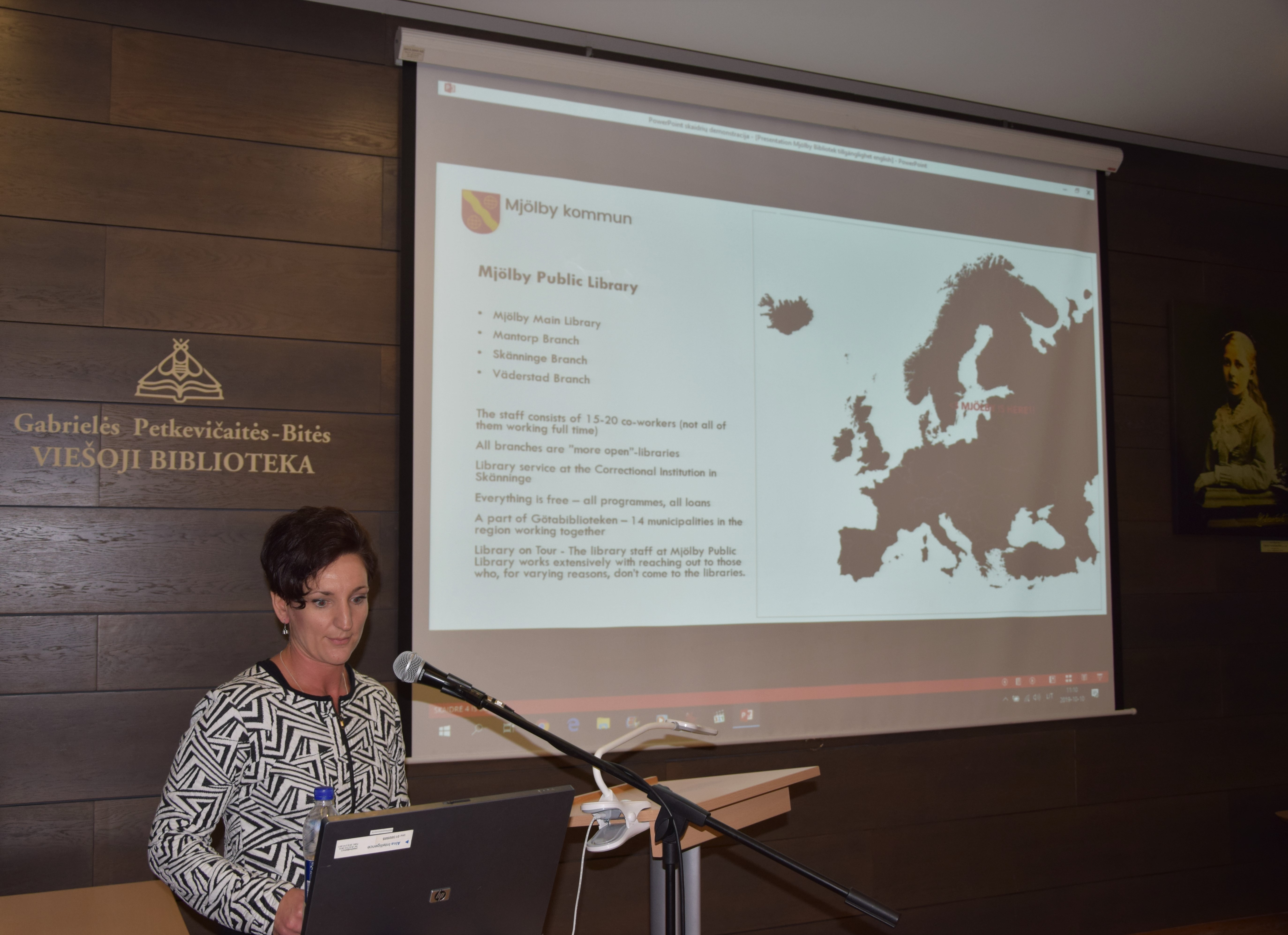 Švedijos Mjölby bibliotekos direktorė Anya Feltreuter pranešime „Biblioteka visiems! Įtrauktis ir paslaugų prieinamumas Švedijos viešosiose bibliotekose“ pristatė bibliotekos veiklas ir jų prieinamumą visiems miesto gyventojams. Direktorė nurodė, kad bibliotekoje nėra jokių apribojimų: vartotojai paslaugomis gali naudotis 24 valandas per parą, jokių delspinigių sistemos, viskas bibliotekoje yra nemokama, siekiant pritraukti kuo daugiau lankytojų, imigrantų, skatinti juos turiningai leisti laisvalaikį ir domėtis literatūra. Bibliotekininkai du kartus per savaitę lankosi pataisos įstaigose, pristato knygas norintiems skaityti literatūrą. Neįgaliesiems asmenims biblioteka sukūrė naują paslaugą ,,Knygos pakeliui“, žmonėms, kurie negali pasiekti bibliotekos, knygos pristatomos į namus ar neįgaliųjų priežiūros įstaigas. Taip pat vyksta specialios ekskursijos po biblioteką autizmo spektro sutrikimą turintiems vaikams, šios paslaugos pavadinimas – ,,VIP turai“. Bibliotekos direktorės teigimu, ši paslauga naujiems bibliotekos vartotojams padeda atsikratyti baimės naudotis biblioteka Šių metų lapkritį biblioteka organizuos ,,Pride week“ solidarumo akciją, šią idėją įgyvendins bendradarbiaudama su miesto socialiniais darbuotais. Direktorė teigia, kad tai puiki iniciatyva paskatinti miesto gyventojus atkreipti dėmesį žmogaus teises.