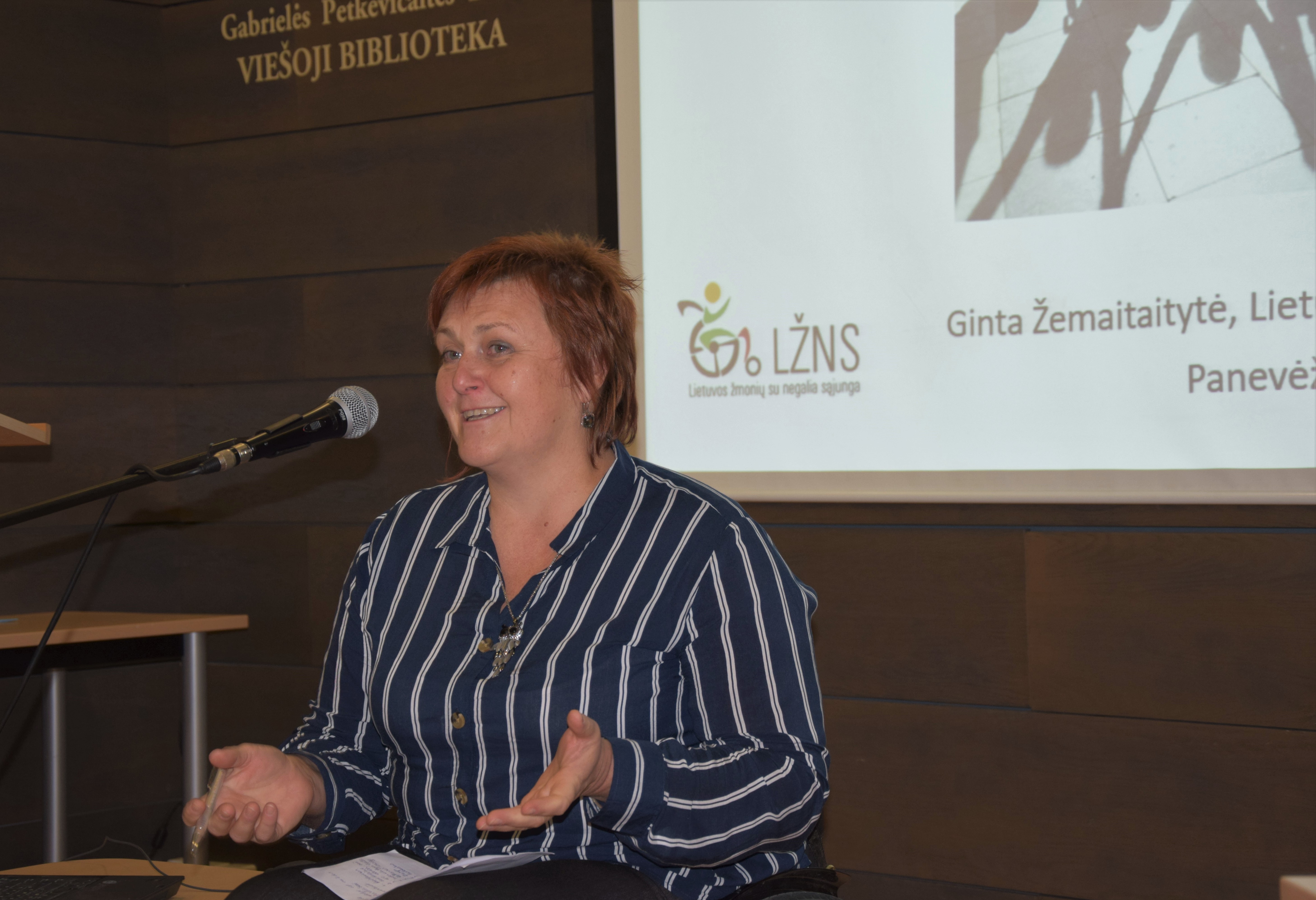 Lietuvos žmonių su negalia sąjungos projektų koordinatorė Ginta Žemaitaitytė kalbėjo apie neįgaliųjų dalyvavimą kultūriniame gyvenime. Pasakodama apie savo patirtį, įvardino kliūtis, su kuriomis susiduria neįgalieji asmenys, atvykdami į viešąsias erdves. Tik maža dalis šių erdvių yra pritaikytos įvairias negalias turintiems asmenims, todėl vis dar juntama diskriminacija neįgaliųjų atžvilgiu. G. Žemaitaitytė pateikė pavyzdžius, rekomendacijas, į ką reikėtų atkreipti dėmesį, kad viešųjų įstaigų prieinamumas būtų patogesnis negalias turintiems gyventojams. Pristatymo metu išskyrė juntamus įvairius socialinius barjerus ir lygiavertiškumo trūkumą kasdienėse situacijoje. Informaciniame filmuke seminaro dalyviai pamatė iššūkius, su kuriais neįgalieji susiduria kiekvieną dieną. Baigdama pranešimą G. Žemaitaitytė linkėjo toliau plėtoti bendradarbiavimą ir įsiklausyti į vieni kitų pastabas, kad kartu galėtume pasiekti rezultatų, kurie padėtų užtikrinti visapusišką neįgaliųjų integraciją į kultūrinį laisvalaikį.