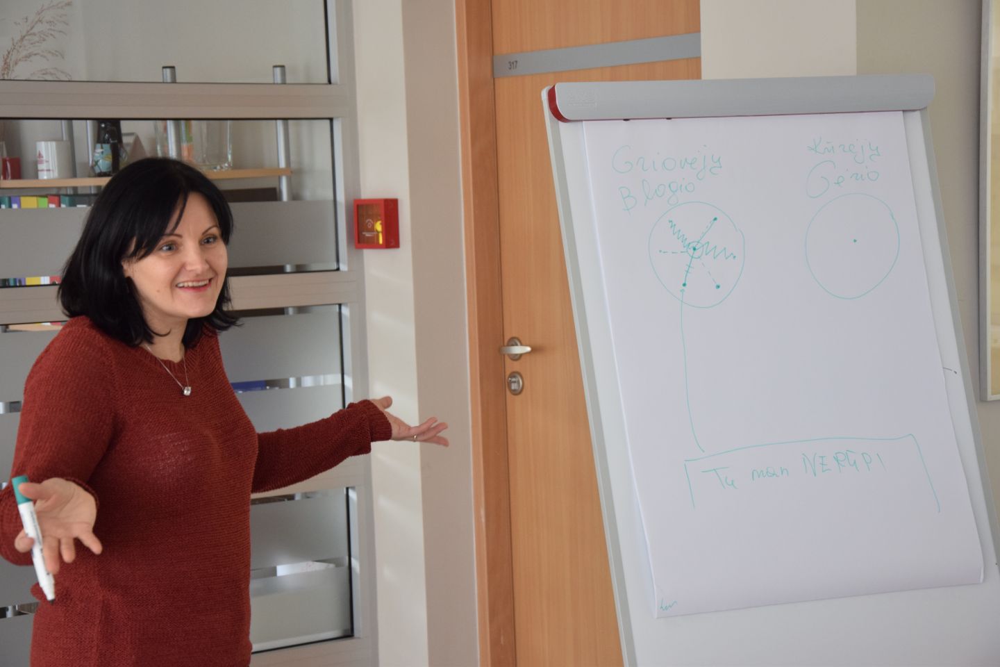 Neuroedukologė Rėda Grigaitienė pristatė neuroedukaciją ir metodus, kuriais galima įvykdyti pokyčius kasdienybėje, įžvelgiant galimybes, kaip padėti sau ir kitiems. Neuroedukacijos uždaviniai: socialinio, emocinio ir dvasinio intelektų ugdymas. Neuroedukacijai vykdyti pasitelkiami dailės terapijos metodai, kurie padeda žmogui atsipalaiduoti ir susitelkti į savo pasąmonę. Pranešimo metu buvo pristatyti įvairūs vizualizacijos pratimai, kurie padeda atgauti emocinį balansą. Taip pat buvo pateiktos rekomendacijos, kaip padėti sau ir aplinkiniams atkuriant ryšį su savimi, kolegomis ir šeimos nariais. Neuroedukacijos metu seminaro dalyviai išmoko metodų, kaip atsikratyti negatyvių minčių, atsipalaiduoti ir siekti pozityvumo.