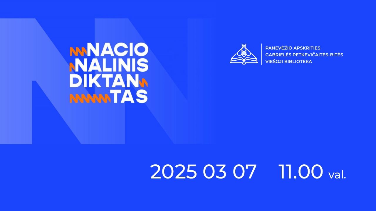 Kovo 7 d. 11 val. Panevėžio apskrities Gabrielės Petkevičaitės-Bitės viešosios bibliotekos Pažinimo erdvėje (III a.) kviečiame rašyti populiarųjį Nacionalinį diktantą – pasitikrinti rašybos įgūdžius, pasivaržyti, pasimokyti. Bet kuriuo atveju tai – galimybė didžiuotis unikalia lietuvių kalba.