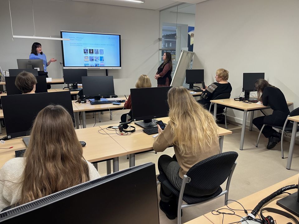 Vyr. bibliotekininkė Aušra Veličkienė pasakojo apie kultūros paveldo viešinimą portale „Panevėžio kraštas virtualiai“, bibliotekos tinklalapyje, socialiniuose tinkluose, virtualių parodų rengimą pasitelkiant skaitmeninius vaizdus ir bibliotekoje sukauptą dokumentinį paveldą.
