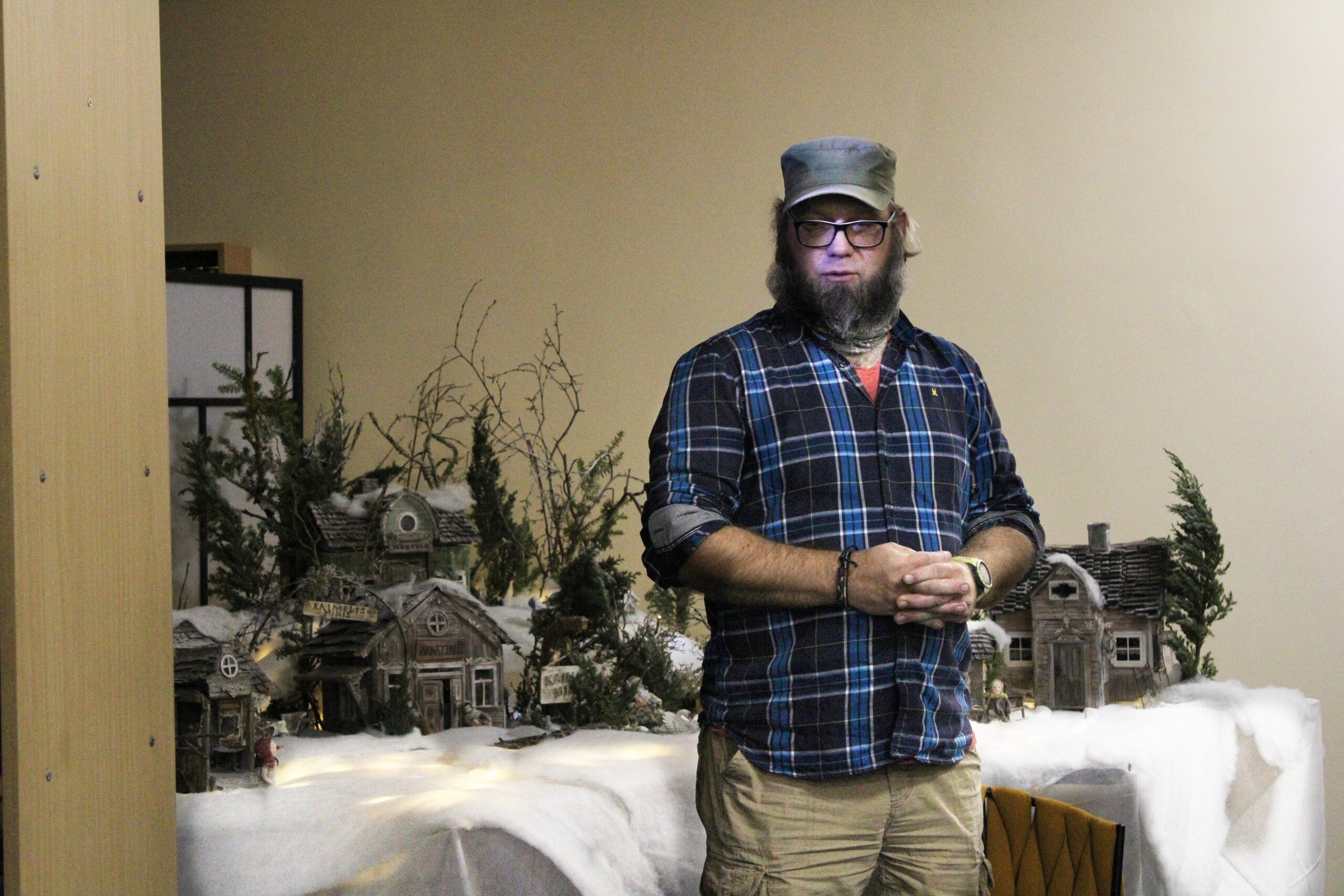 Ši nuotrauka rodo vyrą, stovintį prieš kalėdinę dekoraciją su mažais nameliais ir žaliuojančiomis eglutėmis. Jis dėvi mėlyną ir žalią languotą marškinį, šortus ir kepurę. Vyras laiko rankas susikryžiavęs prieš save, o fone matyti žiemos tema su sniegu ir mažais šviesos elementais.