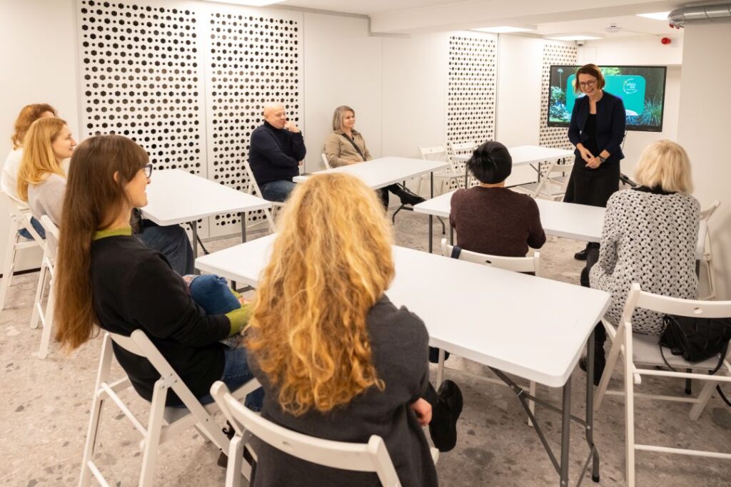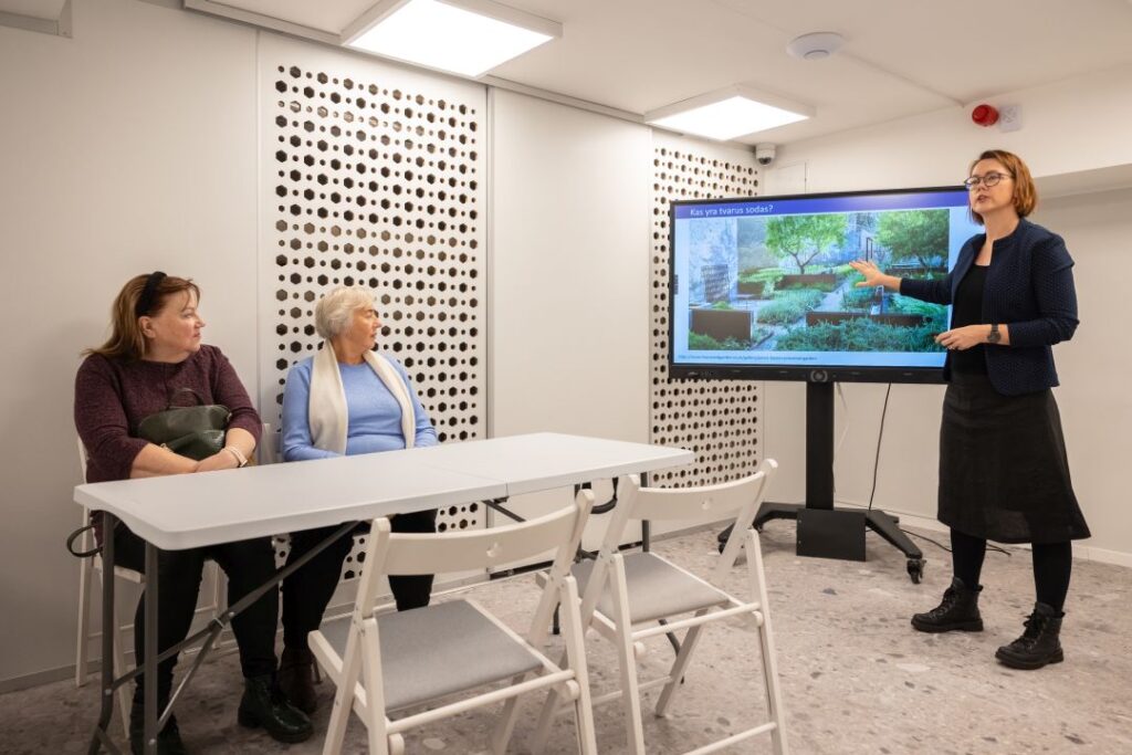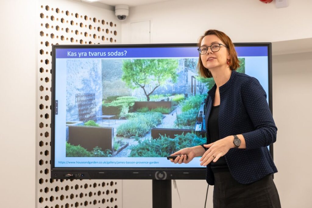 Dalyviai diskutavo apie šiuolaikinį apželdinimą, žaliąsias iniciatyvas ir aplinkosaugos idėjas. Susitikime su LRT laidos „Čia mano sodas“ vedėja Lina Liubertaite kritiškai vertino žaliąsias iniciatyvas ir nagrinėjo apželdinimo pavyzdžius iš šiuolaikinio dizaino perspektyvų.
