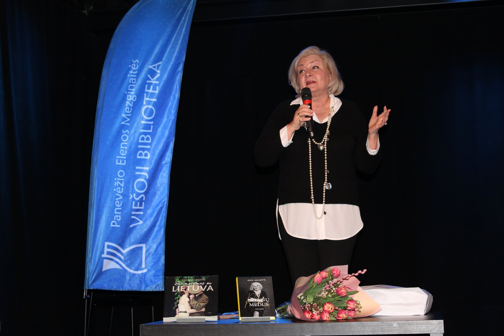 Scenoje stovi moteris su mikrofonu rankoje ir kalba auditorijai. Šalia jos – mėlyna vėliava su užrašu „Panevėžio Elenos Mezginaitės viešoji biblioteka“. Ant stalo priešais matomos dvi knygos ir gėlių puokštė. Tamsus fonas pabrėžia renginio atmosferą.