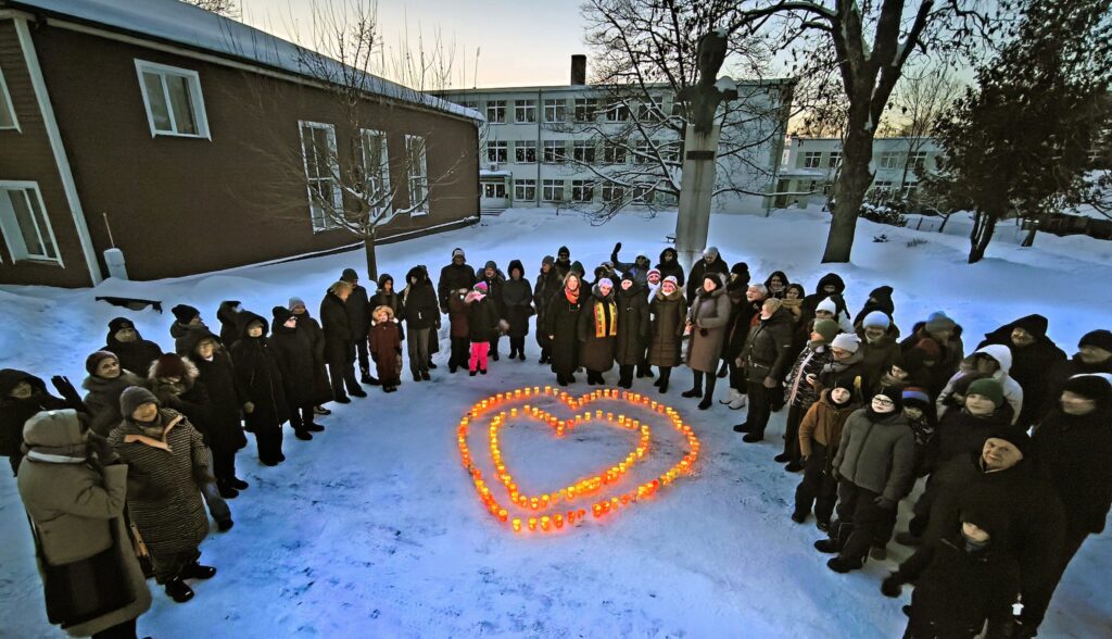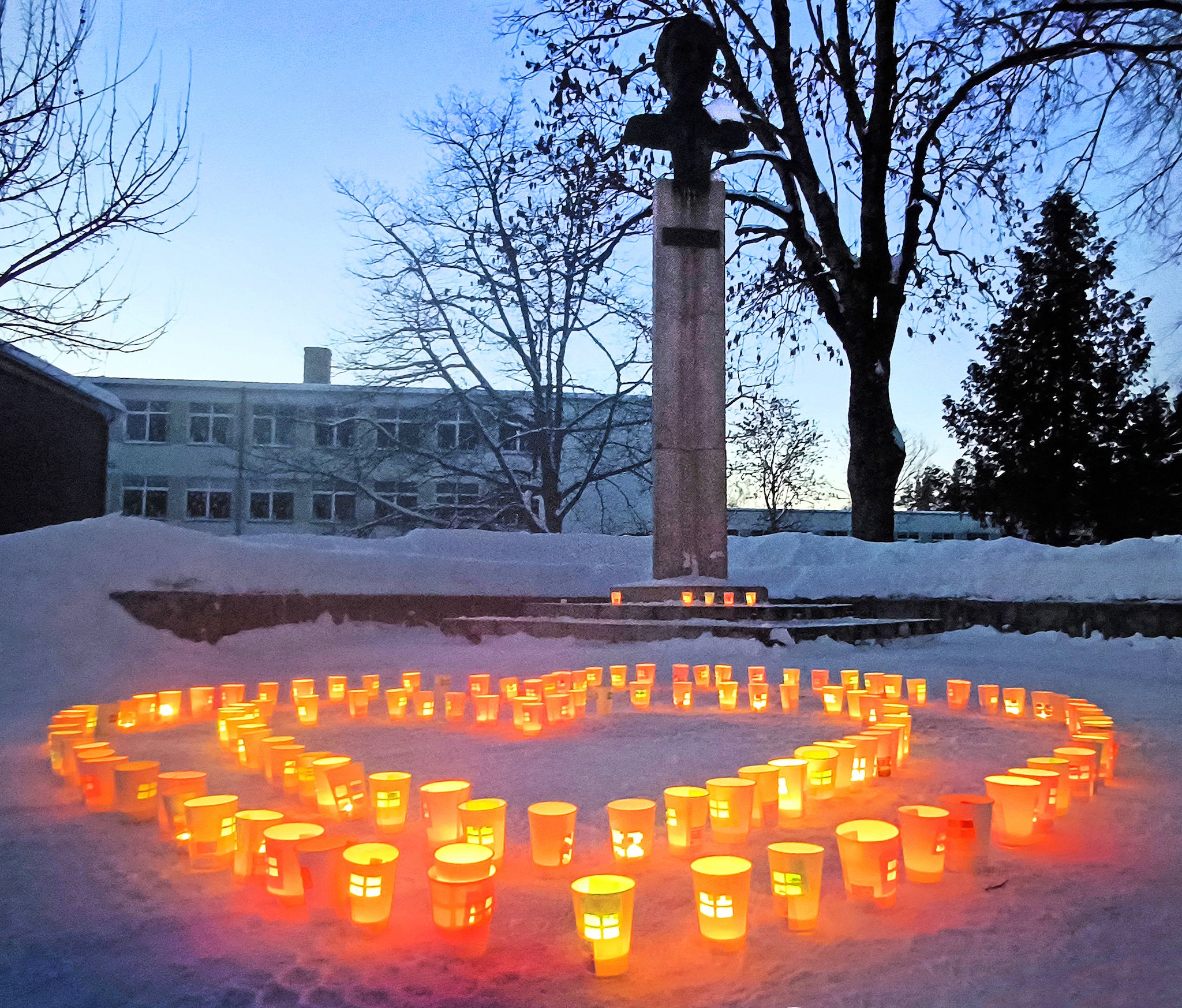 Žiemos vakare sniege sustatytos degančios žvakės sudaro širdies formą. Fone matyti paminklas su biustu ir medžiai be lapų, aplink sniego pusnys bei pastatas.