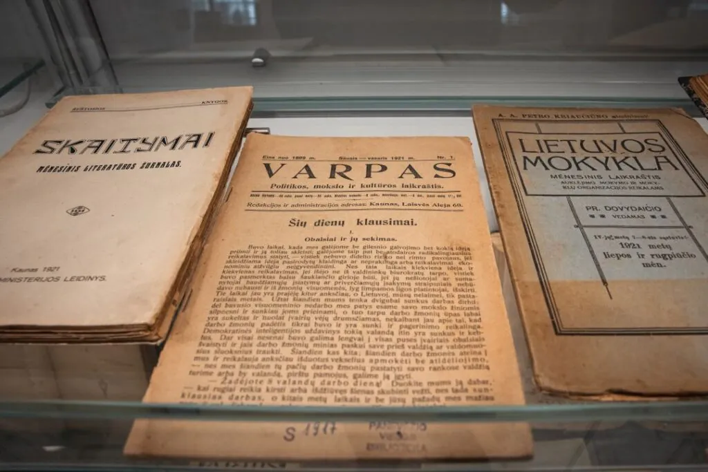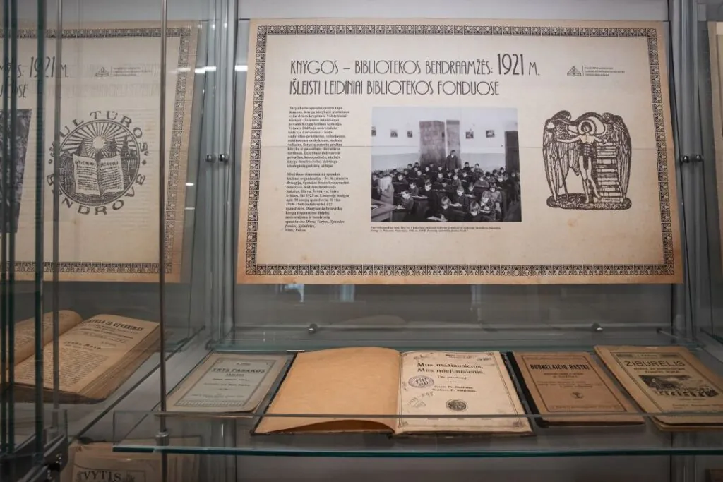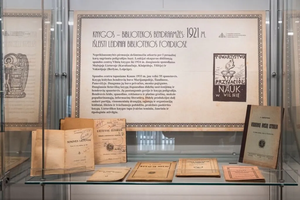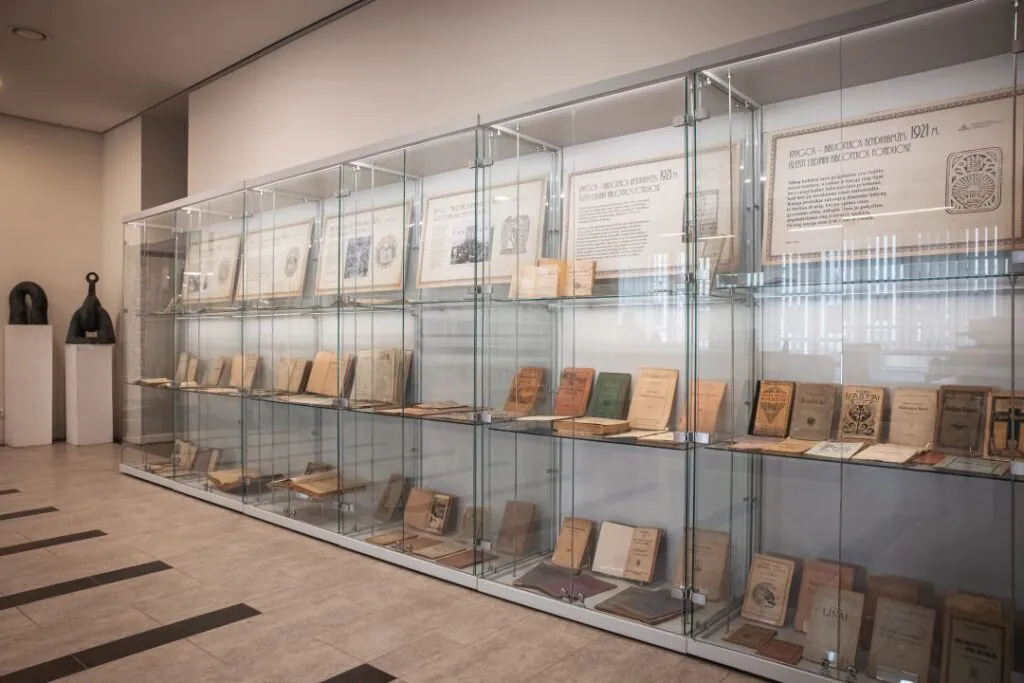 Bibliotekos erdvėje ekspozicijų stenduose eksponuojama knygų paroda „Knygos – bibliotekos bendraamžės: 1921 m. išleisti leidiniai bibliotekos fonduose“