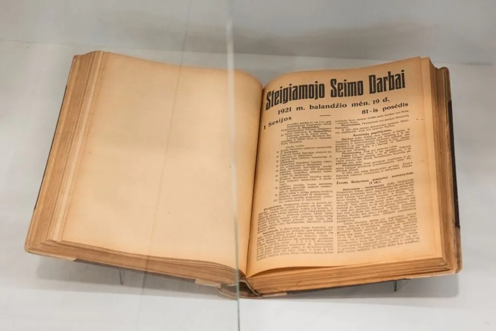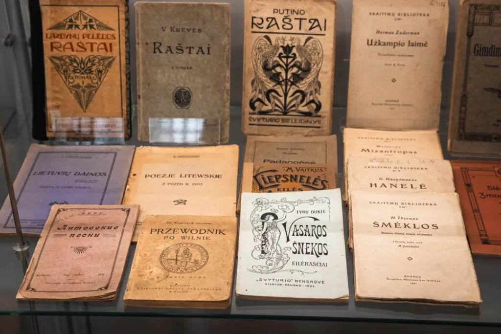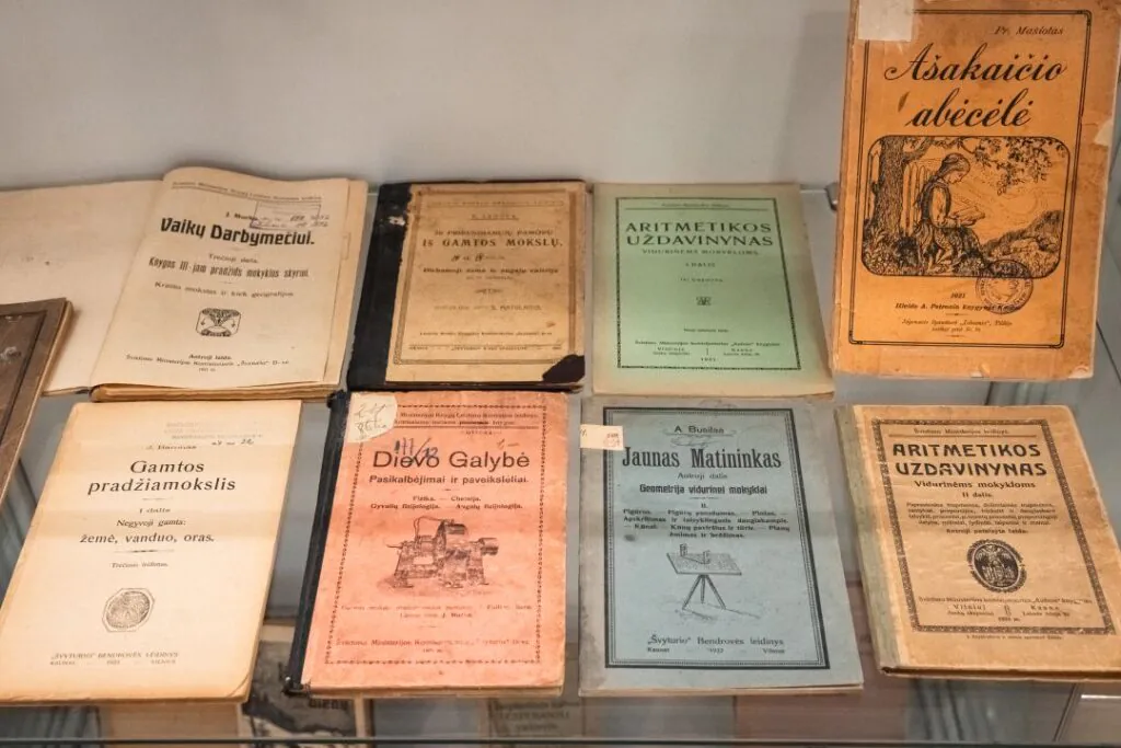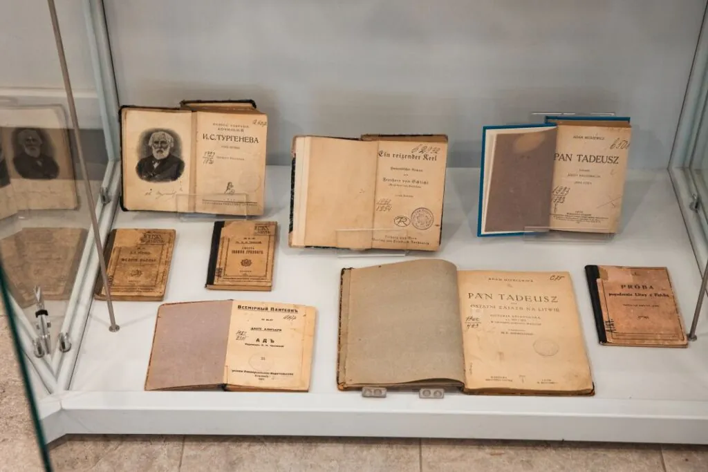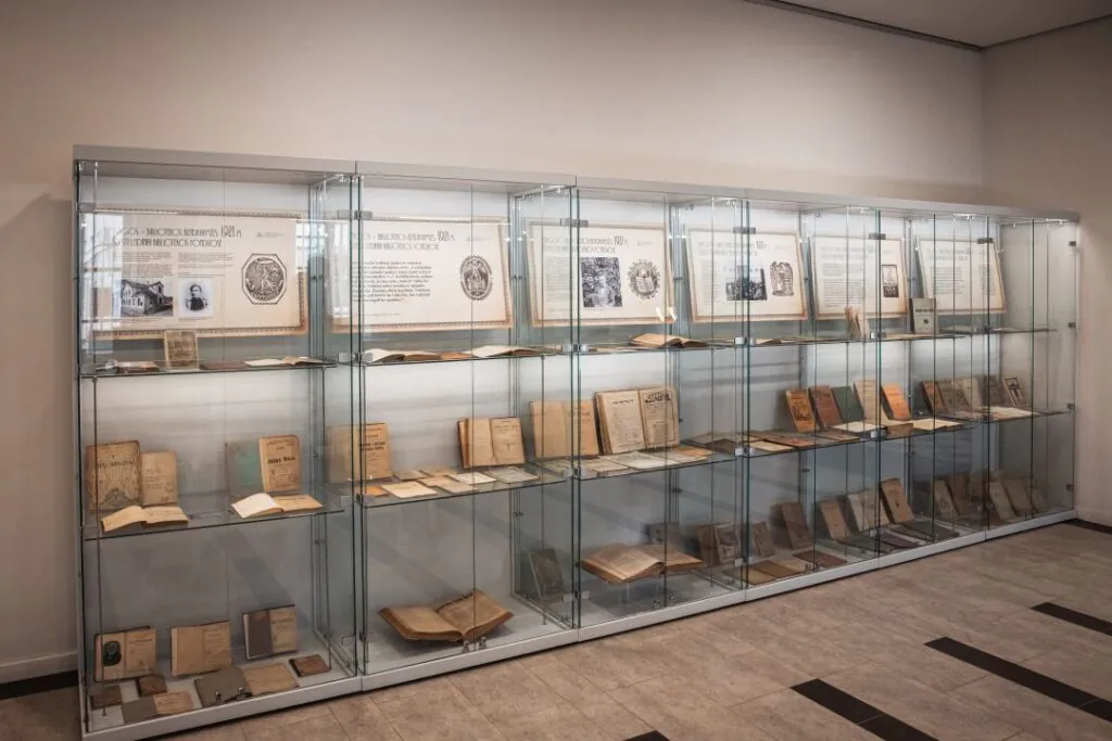 Bibliotekos erdvėje ekspozicijų stenduose eksponuojama knygų paroda „Knygos – bibliotekos bendraamžės: 1921 m. išleisti leidiniai bibliotekos fonduose“