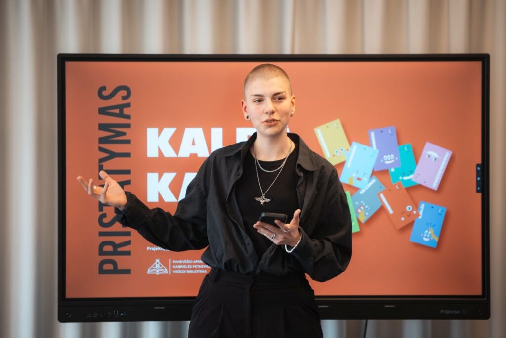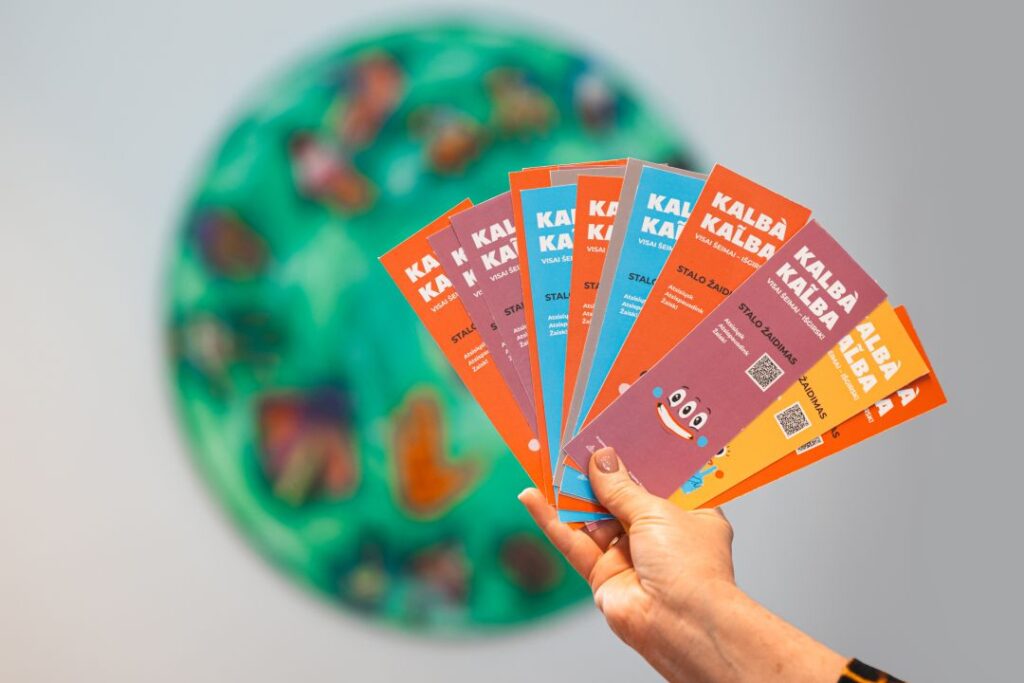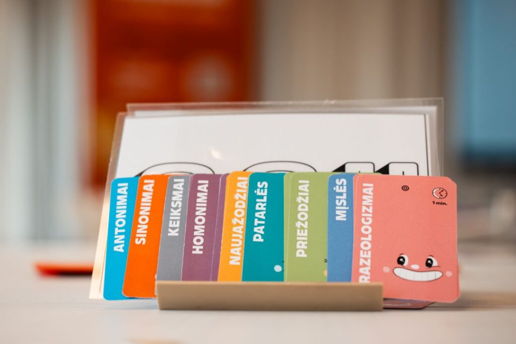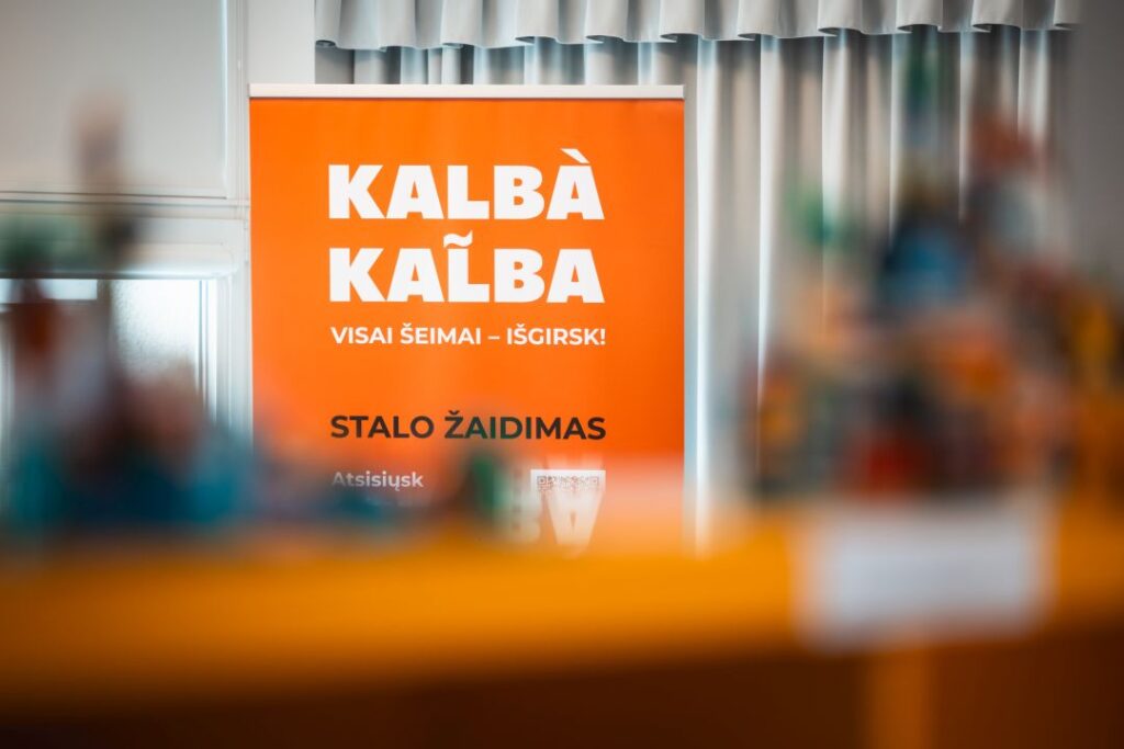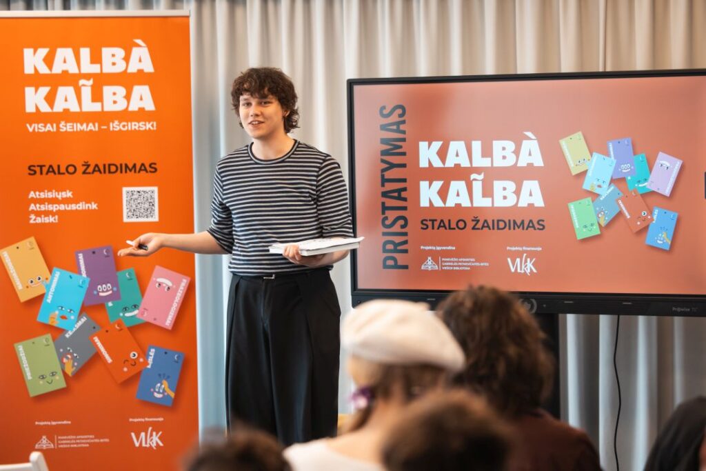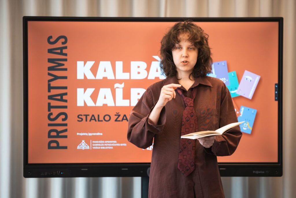 Panevėžio apskrities Gabrielės Petkevičaitės-Bitės viešosios bibliotekos Vaikų ir jaunimo kultūrinės edukacijos skyriuje pristatytas bibliotekos sukurtas lietuvių kalbos stalo žaidimas „Kalbà kal̃ba“.