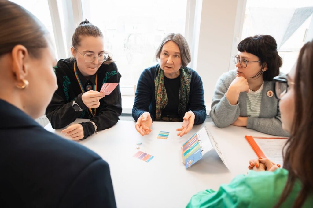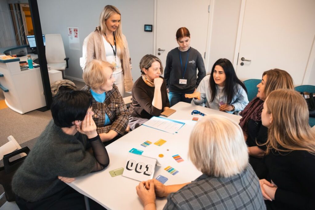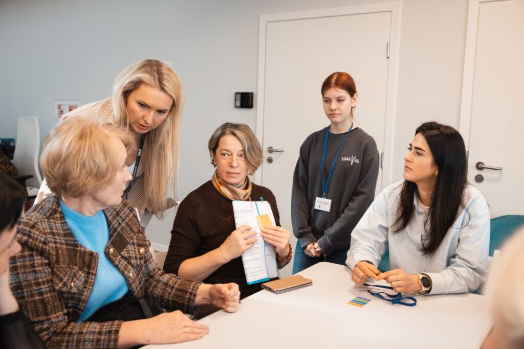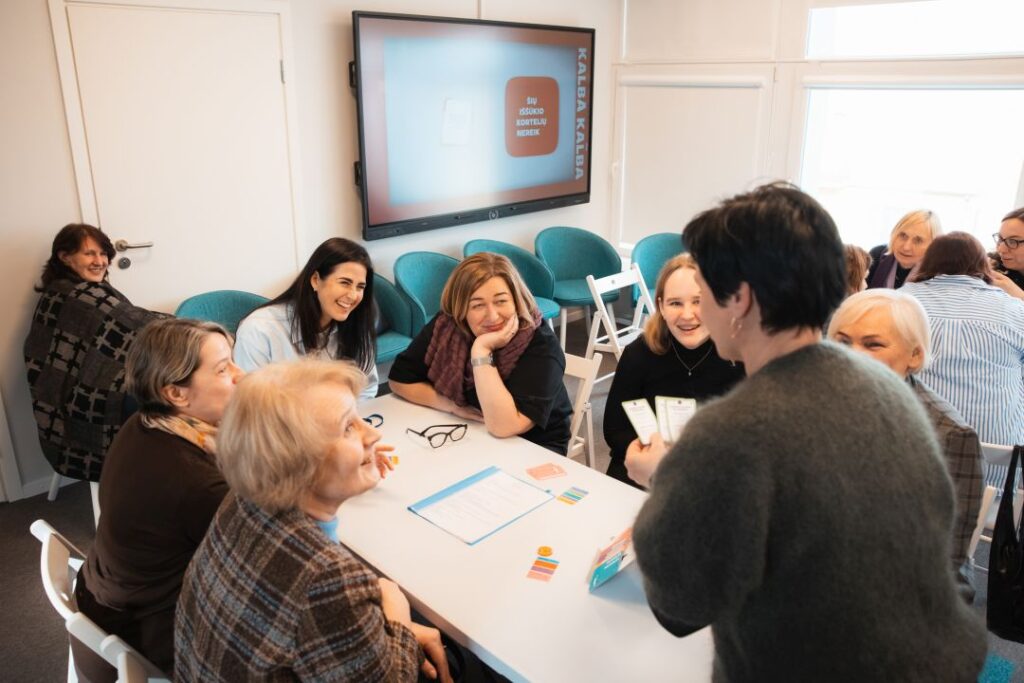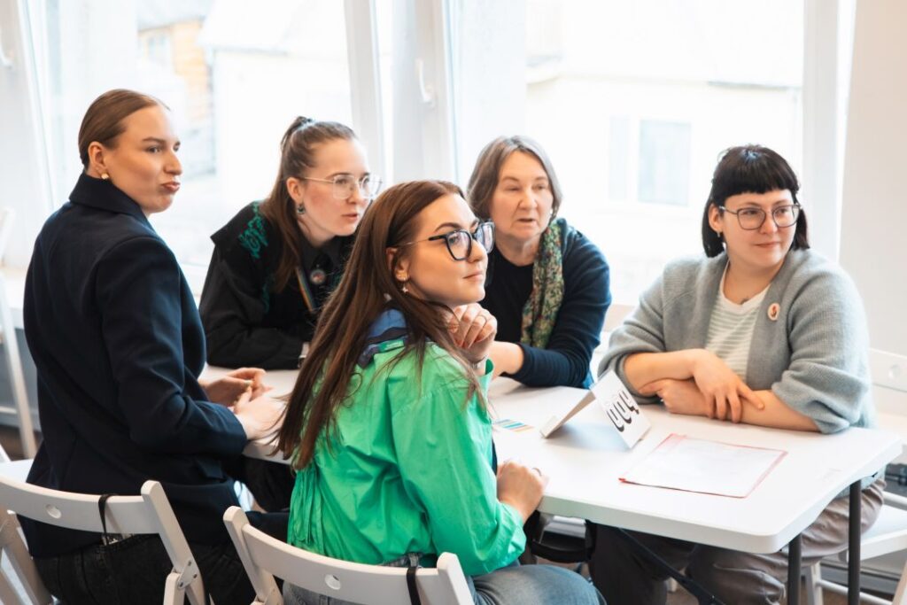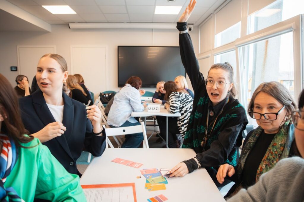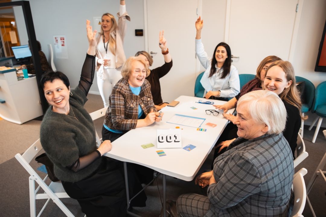 Grupė renginio dalyvių sėdi aplinkui stalą ir linksmai kelia rankas