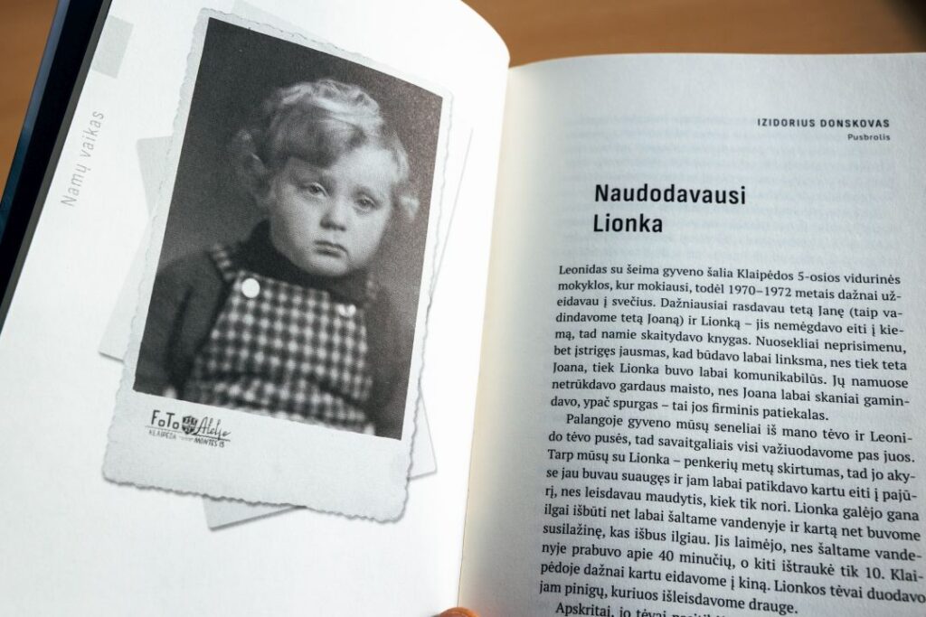 „Leonido mamai darbar 90 metų, ji labai stipriai paliesta senatvinės demencijos. Kažkokių nuotrupų galėtų papasakoti, bet tai būtų kone tos pačios trumpos, juokingos istorijos, kurias žinau ir pati. Pavyzdžiui, ši (jos knygoje nėra). Leonido tėtis – iš Butrimonių miestelio prie Alytaus, kur po karo iš 1500 žydų gyvų liko lygiai 11. Tarp šių – Leonido seneliai, tėtis ir jo brolis. Seneliai išsikraustė gyventi į Palangą, tėvas su broliu – į Klaipėdą, jiems teko pasikeisti pavardes, nes nebuvo leidžiama žydiška tapatybė. Tačiau seneliai su sūnumis tarpusavyje bendravo jidiš kalba. Tad štai – Leonidui ketveri. Atvažiuoja seneliai, visi šnekasi. Jiems išvykus Leonidas mamos klausia: „Kokia čia kalba buvo? Kodėl mes ja nešnekame?”. Mama paaiškina: žydų. O mes kas esame? – Žydai, tačiau kalbame lietuviškai. Tada Leonidas su ašarom akyse: „Mama, mes tokie padorūs lietuviai, tačiau atvažiavo seneliai ir mus nužydino”, – šypsosi.