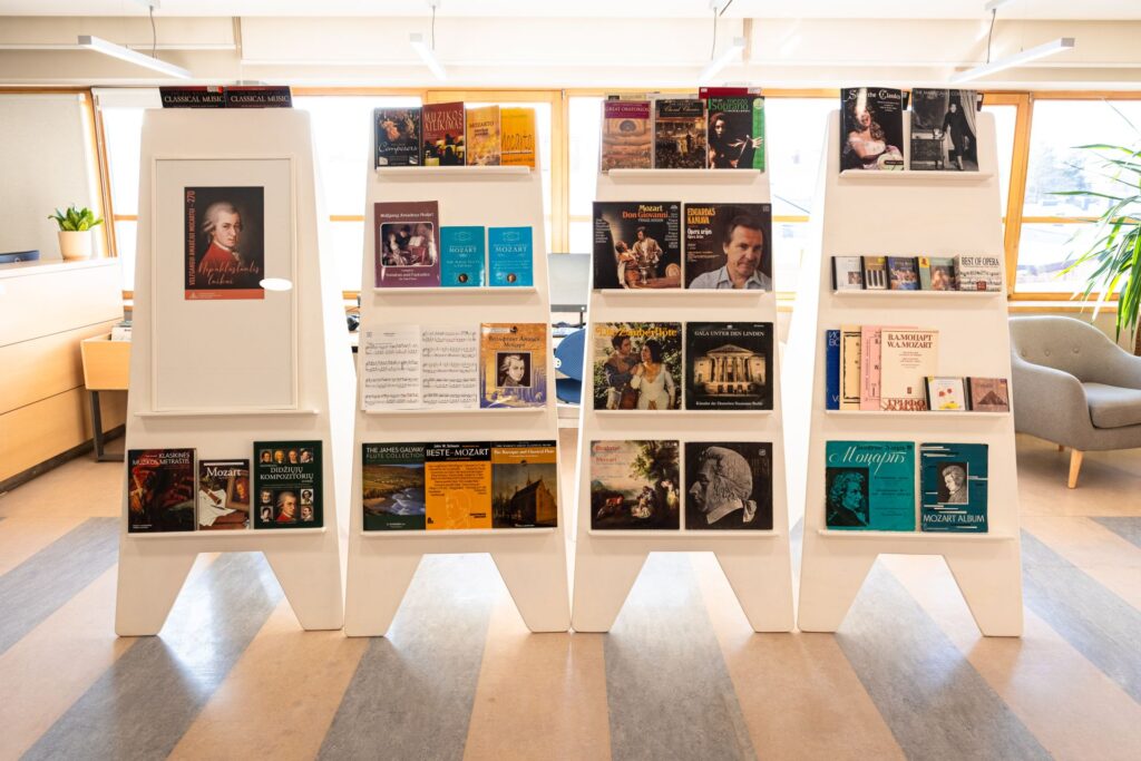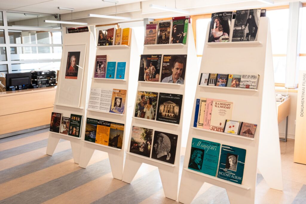 Galima susipažinti su dalimi natų rinkinių, operų klavyrų ir partitūrų, leidžiančių iš arti pažvelgti į kompozitoriaus muzikinę kalbą bei genialumą. Viską papildo vinilo plokštelės, CD ir DVD, atskleidžiantys įvairias Mocarto kūrinių interpretacijas ir atlikimo tradicijas.